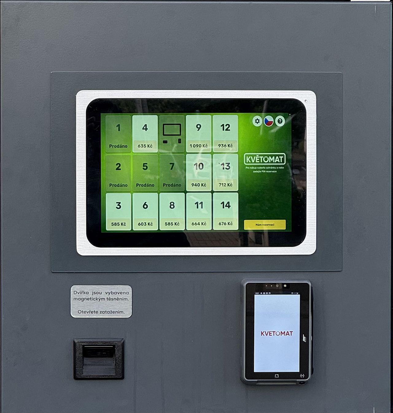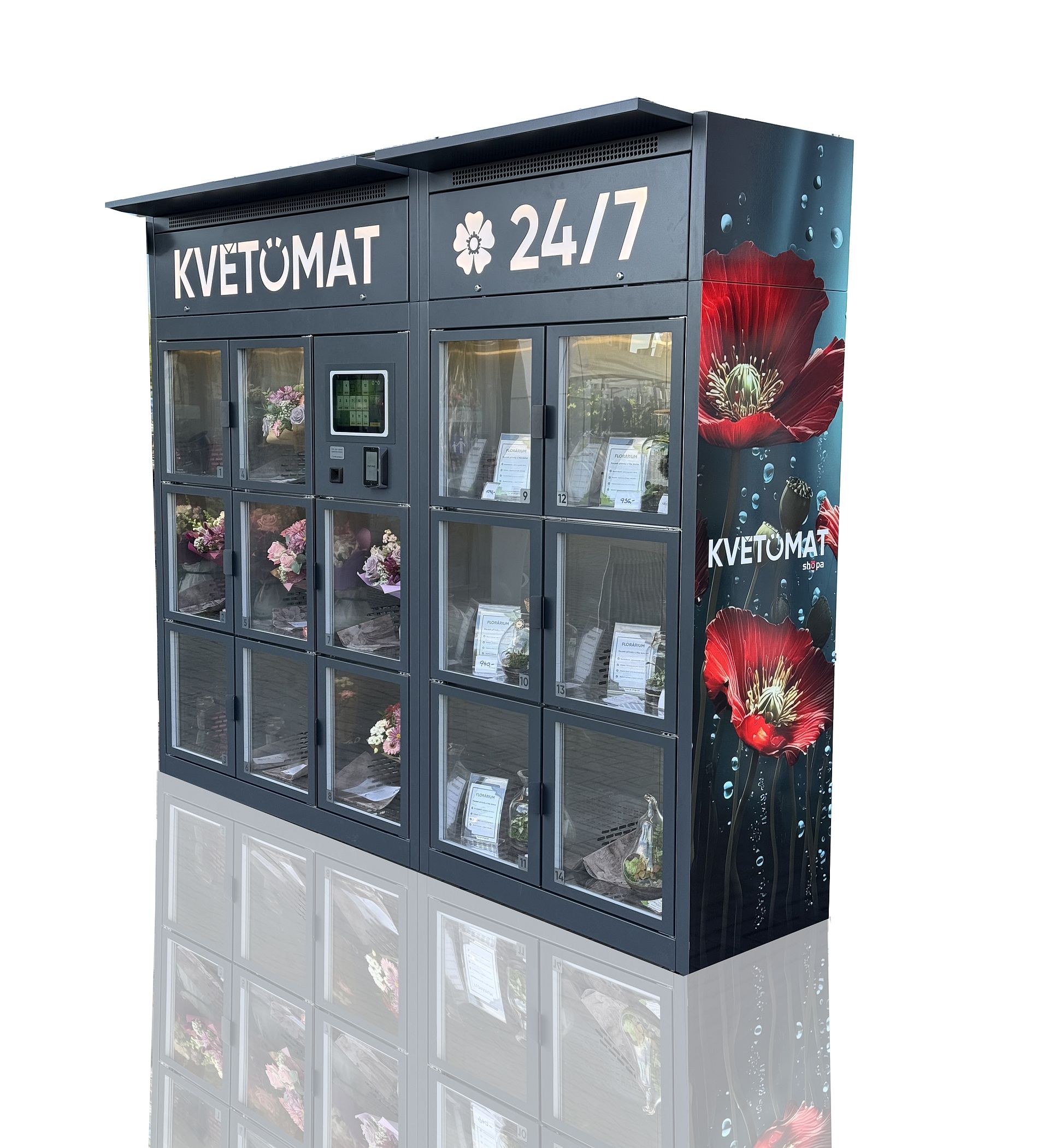 První Květomat vyrobený v ČR. Jediný originální stroj na prodej a výdej květin vyrobený, servisovaný a distribuovaný v ČR. Nejde o žádnou vestavbu do ledničky ani polský nebo čínský dovoz. Vlastní výroba, servis i vývoj.V prodeji ve variantě s 8-mi nebo 14-ti výdejními boxy.Proč Květomat?vydělávejte i když máte zavřenobez dalších zaměstnancůžádné nemocenské, dovolenépostačí připojení k el.energii (230 V)prodávejte nonstop - 24/7bezobslužný platební systémjednoduché ovládánínastavitelná klimatizacečerstvé květiny po celý denVybavení:moderní dotykové ovládánísnadná administraceuniverzální platební terminálcelonerezové provedenízastřešeníudržování stálé teploty po celý rokdohledová kamera s aplikacíudržení teploty v případě výpadku proududvířka s izolačním dvojsklembarva v jakémkoliv odstínu RALmnoho možností vybavení a doplňkůantifog systém, 100% proti zamlžováníLED osvětlení skříněkSMS report - aktuální prodejmožnost vyzvednutí na PINvlastní prosvětlené logo vlastní design přístrojemontáž a doprava