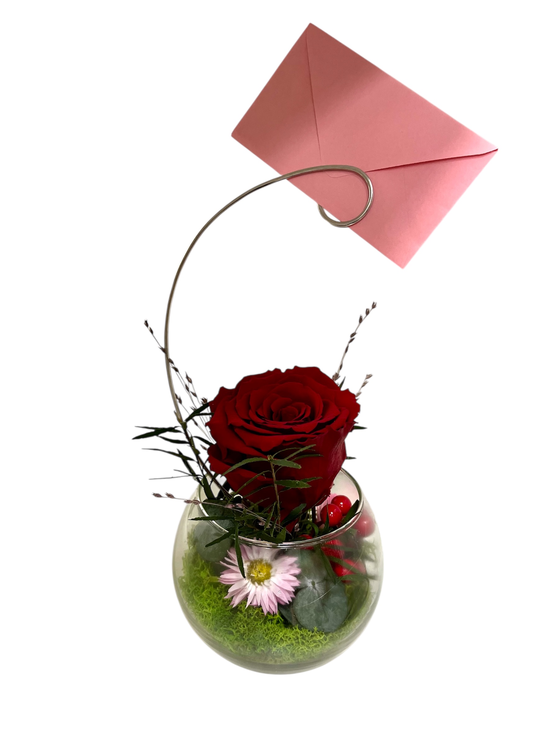 Nadčasová dekorace která neuvadne. Dopřejte si květy které vydrží krásné dlouhé měsíce. Tato stabilizovaná růže je usazená v pečlivě sladěném aranžmá se sušenými prvky, stabilizovaným eukalyptem a břečťanem. Vše je uloženo v elegantní skleněné kouli a vše vypadá jemně, čistě a hodí se do každého interiéru. stabilizované květiny si zachovávají svůj přirozený vzhled bez nutnosti péče. Nevadí jim sucho ani tma - stačí ji jen neumisťovat na přímé slunce, do vlhkého prostředí a nezalévat.velikost - průměr 10cm